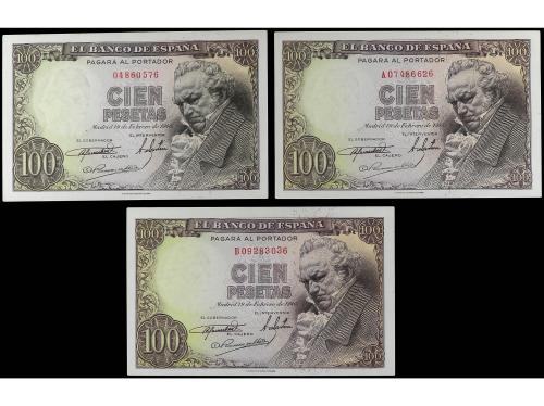 ESTADO ESPAÑOL. Lote 3 billetes 100 Pesetas. 19 Febrero 1946. Goya. Sin Serie, Serie A y B. Ed-451, 451a, 451b. EBC a SC.