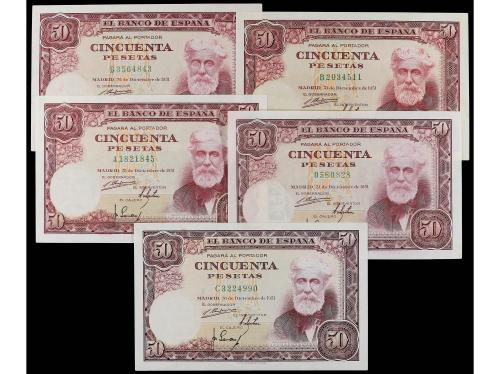 ESTADO ESPAÑOL. Lote 5 billetes 50 Pesetas. 31 Diciembre 1951. Rusiñol. Sin serie y Series A, B y C. Ed-462, 462a. EBC a EBC+.