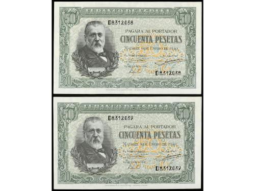 ESTADO ESPAÑOL. Lote 2 billetes 50 Pesetas. 9 Enero 1940. Menéndez Pelayo. Serie D. Pareja correlativa. Ed-437a. EBC-.