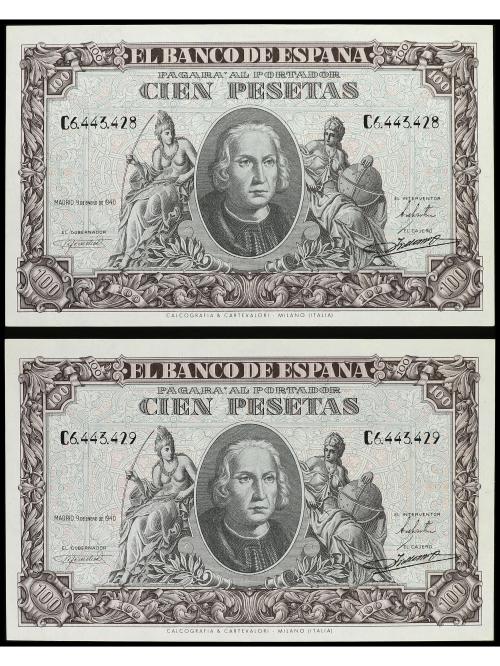 ESTADO ESPAÑOL. Lote 2 billetes 100 Pesetas. 9 Enero 1940. Colón. Serie C. Pareja correlativa. Ed-438a. EBC+.