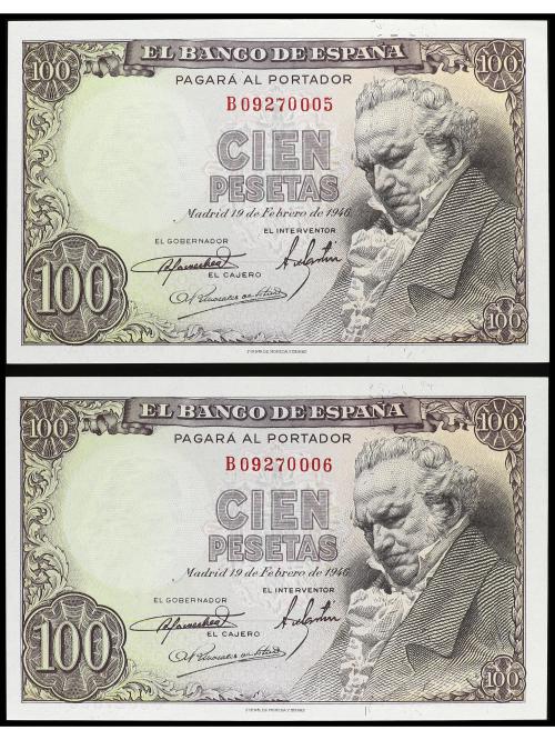 ESTADO ESPAÑOL. Lote 2 billetes 100 Pesetas. 19 Febrero 1946. Goya. Serie B. Pareja correlativa. Ed-451b. SC-.