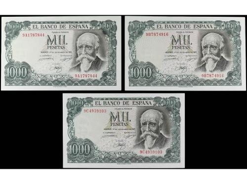 ESTADO ESPAÑOL. Lote 3 billetes 1.000 Pesetas. 17 Septiembre 1971. Echegaray. Numeración especial Serie 9A, 9B y 9C. Ed-474d. EBC a SC.