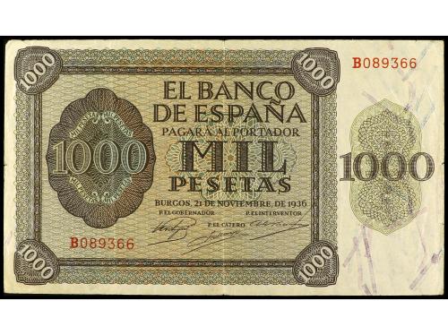 ESTADO ESPAÑOL. 1.000 Pesetas. 21 Noviembre 1936. Alcázar de Toledo. Serie B. (Pequeñas roturas). Ed-423. MBC.