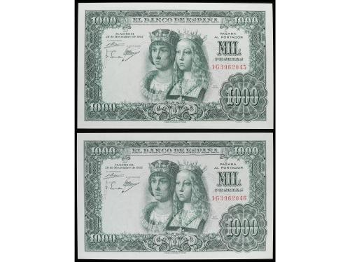 ESTADO ESPAÑOL. Lote 2 billetes 1.000 Pesetas. 29 Noviembre 1957. Reyes Católicos. Serie 1G. Pareja correlativa. Ed-469b. SC-.
