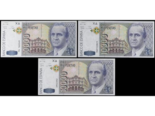 JUAN CARLOS I. Lote 3 billetes 10.000 Pesetas. 12 Octubre 1992. Juan Carlos I. Sin Serie y Series 9A y 9B. Ed-485, 485b. SC- a SC.