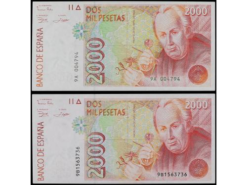 JUAN CARLOS I. Lote 2 billetes 2.000 Pesetas. 24 Abril 1992. Celestino Mutis. Series numeración especial 9A y 9B. E-482b y 482c. SC- a SC.