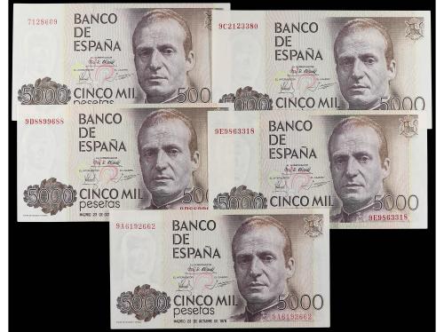 JUAN CARLOS I. Lote 5 billetes 5.000 Pestas. 23 Octubre 1979. Juan Carlos I. Sin Serie, Series 9A, 9C, 9E, 9D. A EXAMINAR. Ed-478, 478b. MBC+ a SC-.