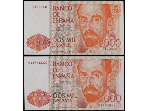 JUAN CARLOS I. Lote 2 billetes 2.000 Pesetas. 22 Julio 1980. Juan Ramón Jimenez. Sin serie y Serie 9A. Ed-479, 479b. EBC+ a SC.