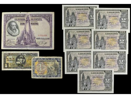 Lote 10 billetes 1 (2), 2 (7), 100 Pesetas. 1928, 38, 40. A EXAMINAR. Ed-355, 429a, 441, 442a. MBC- a EBC-.