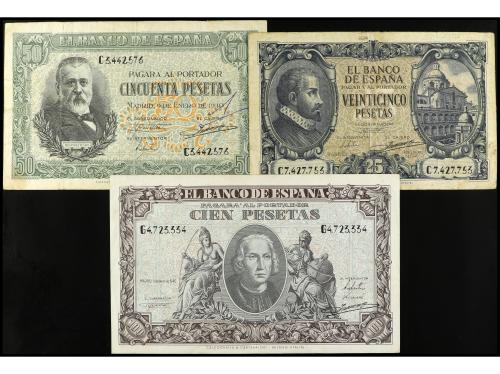 ESTADO ESPAÑOL. Lote 3 billetes 25, 50 y 100 Pesetas. 9 Enero 1940. Herrera Serie C, Menendez pelayo Serie C y Colón Serie G. A EXAMINAR. Ed-436a, 437a, 438a. MBC- a MBC+.
