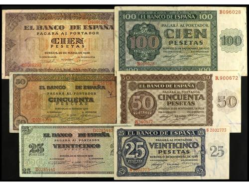 ESTADO ESPAÑOL. Lote 6 billetes 25 (2), 50 (2), 100 Pesetas (2). 21 Noviembre 1936 y 20 Mayo 1938. A EXAMINAR. Ed-419b, 420a, 421a, 430a, 431b, 432a. MBC- a MBC+.