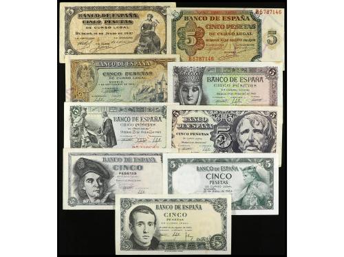 Lote 9 billetes 5 Pesetas. 1937 a 1954. A EXAMINAR. Ed-424a, 435b, 443a, 446a, 449a, 454, 455a, 459a, 466a. MBC- a SC-.