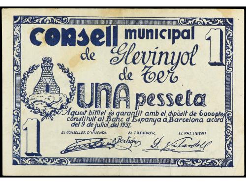 CATALUNYA. 1 Pesseta. 9 Juliol 1937. C.M. de GLEVINYOL DE TER. (Leves manchitas). ESCASO. AT-1137. EBC-.