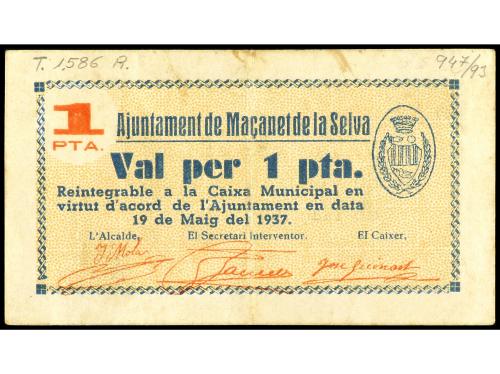 CATALUNYA. 1 Pesseta. 19 Maig 1937. Aj. de MAÇANET DE LA SELVA. (Manchitas). AT-1389. MBC.
