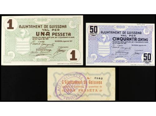 CATALUNYA. Lote 3 billetes 50 Cèntims y 1 Pesseta (2). Aj. de GUISSONA. AT-1225, 1227, 1228. MBC+ a EBC.