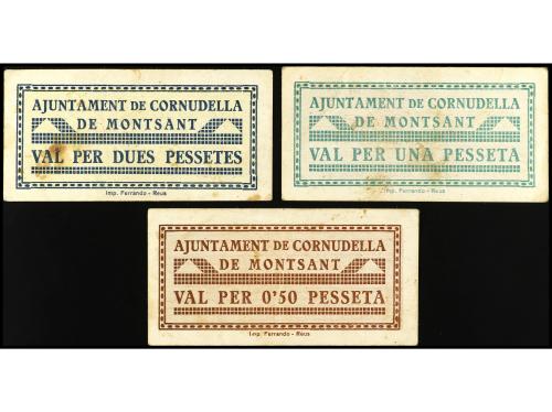 CATALUNYA. Lote 3 billetes 50 Cèntims, 1 y 2 Pessetes. Aj. de CORNUDELLA DE MONTSANT. ESCASOS. AT-892/94. MBC.