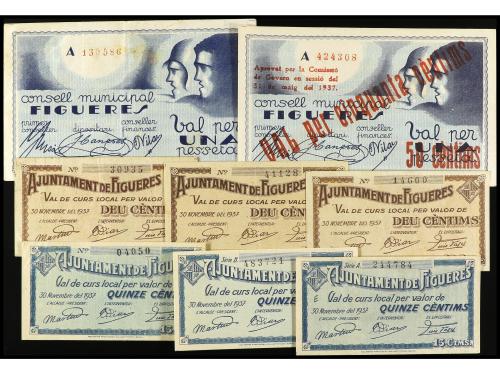 CATALUNYA. Lote 8 billetes 10 (3), 15 (3) y 50 Cèntims y 1 Pesseta. C. M. de FIGUERES. AT-1006/08, 1008a, 1008f, 1009. MBC a SC-.