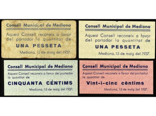 CATALUNYA. Lote 4 billetes 25 y 50 Cèntims y 1 Pesseta (2). Maig 1937. C.M. de MEDIONA. RAROS. AT-1491, 1491a, 1492b, 1493. MBC- a EBC+. Ex Aureo & Calicó `Martí Cot II´ - 16 marzo 2022, n. 1105.