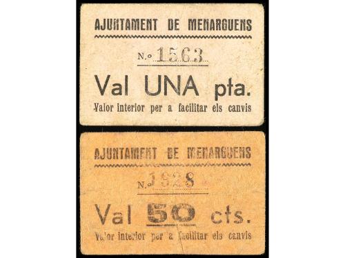 CATALUNYA. Lote 2 billetes 50 Cèntims y 1 Pesseta. Aj. de MENARGUENS. RAROS. AT-1496, 1497. MBC- y MBC+.