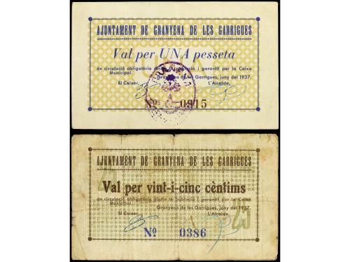 CATALUNYA. Lote 2 billetes 25 Cèntims y 1 Pesseta. Juny 1937. Aj. de GRANYERA DE LES GARRIGUES. (El de 25 cèntims con roturas). MUY RAROS. AT-1183, 1184. BC+ y MBC+.