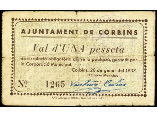 CATALUNYA. 1 Pesseta. 20 Gener 1937. Aj. de CORBINS. (Pequeñas roturas). MUY RARO. AT-884. BC+.