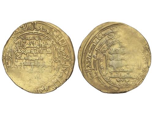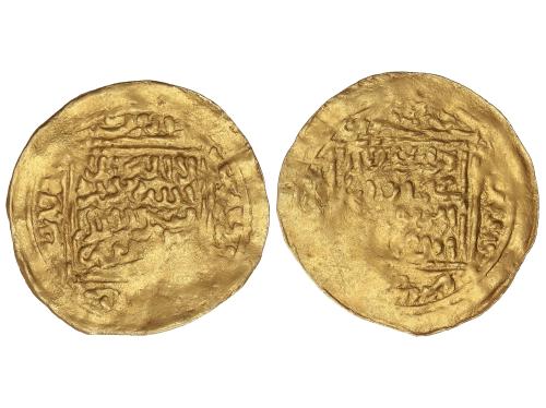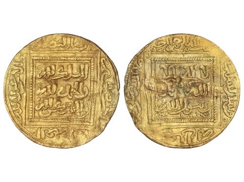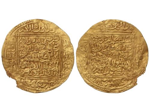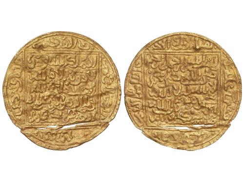 MERINÍES. Dobla. ABU FARIS ABD AL-AZIZ I. MADINAT FAS (Fez). 4,40 grs. AU. Los dinares de ‘Abd al-‘Aziz I y ‘Abd al-‘Aziz II llevan ambos el título de ‘Abd Allah, pero pueden distinguirse fácilmente. Todos los dinares de ‘Abd al-‘Aziz I lo mencionan como amir al-muslimin, seguido de ibn al khulafa al-rashidin; todos presentan inscripciones en el campo en cinco líneas. (Ligera falta del cospel). MUY RARA. A-533; Haz-795. MBC-.