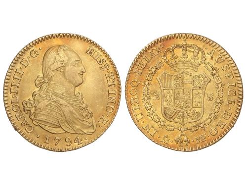 CARLOS IV. 2 Escudos. 1794. MADRID. M.F. 6,86 grs. (Ínfimos golpecitos). Levísima pátina anaranjada irregular. AC-1282. MBC+.