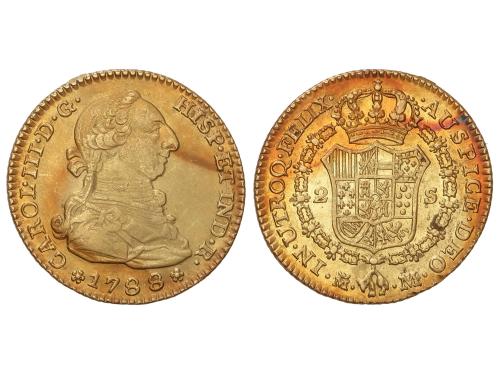 CARLOS III. 2 Escudos. 1788. MADRID. M. 6,78 grs. Pátina anaranjada irregular con restos de brillo original. AC-1578. MBC+/EBC.