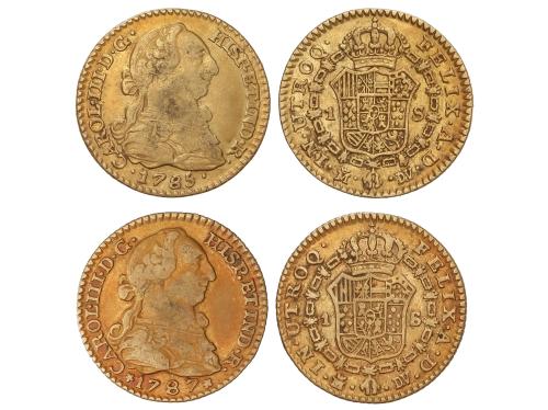 CARLOS III. Lote 2 monedas 1 Escudo. 1785 y 1787. MADRID. D.V. Peso total de 6,68 grs. AC-1367, 1370. MBC.