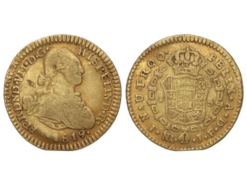 FERNANDO VII. 1 Escudo. 1819. NUEVO REINO. J.F. 3,38 grs. Busto de Carlos IV. (Algo alabeada). AC-1558. MBC-.