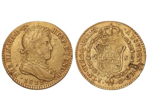 FERNANDO VII. 2 Escudos. 1811. CADIZ. C.I. 6,72 grs. Marca de ceca pequeña y busto drapeado. (Posiblmente ha estado en aro). AC-1576. MBC-.