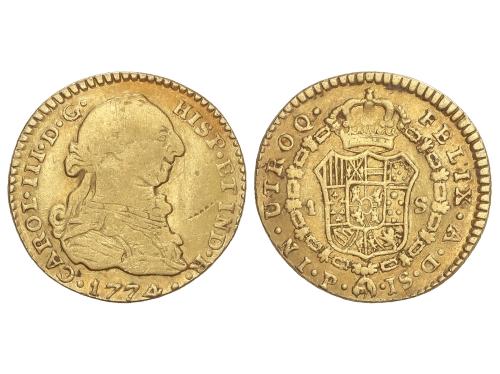 CARLOS III. 1 Escudo. 1774. POPAYÁN. J.S. 2,90 grs. (Pequeños golpecitos, algo alabeada). ESCASA. AC-1417. MBC-.