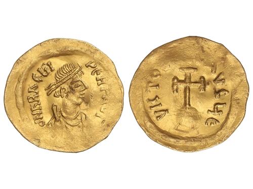 MONEDAS BIZANTINAS. Semissis. 610-641 d.C. HERACLIO. CONSTANTINOPLA. Anv.: d.N. hRACL-US P. AVG. Busto diademado y acorazado de Heraclio a derecha. Rev.: VICTORIA AVG €. Cruz potenzada sobre globo. 2,18 grs. AU. (Acuñación parcialmente floja, pequeño grafiti en reverso). Fr-103; Se-784. EBC-.