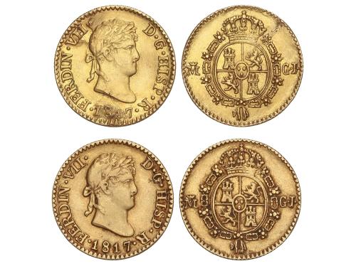 FERNANDO VII. Lote 2 monedas 1/2 Escudo. 1817. MADRID. G.J. 1,80 y 1,71 grs. (Una con hoja en anverso). AC-1486. MBC.