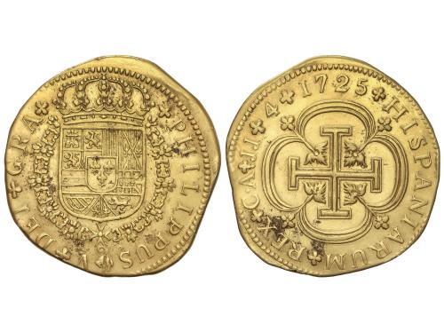 FELIPE V. Reproducción 4 Escudos. 1725. CUENCA. J.J. 12,76 grs. AU (900). Reproducción de la rarísima media onza de Cuenca en tipo macuquino, ¿falsa de época?. (Leves manchitas). AC-tipo 1997. EBC.