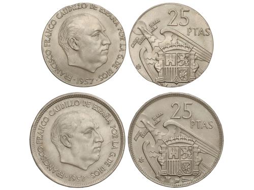 ESTADO ESPAÑOL. Lote 2 monedas 25 Pesetas. 1957 (*68). Una con ERROR, acuñada sobre un cospel de 5 Pesetas. Canto liso sin leyenda (5,69 grs). Incluye moneda sin error para comparar (8,86 grs). EBC a EBC+.