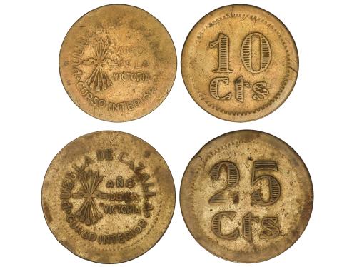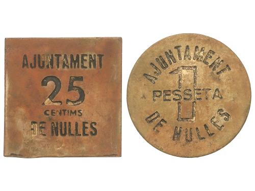 EMISIONES LOCALES GUERRA CIVIL. Lote 2 monedas 25 Cèntims y 1 Pesseta. Aj. de NULLES. RARAS. HG-222, 224; Vti-L30, L32. MBC+.