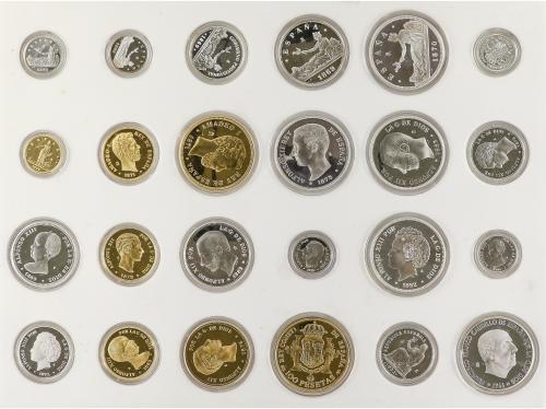 JUAN CARLOS I. Emisión especial conmemorativa de réplicas de las 24 monedas de plata y oro que forman la Historia de la Peseta. Peso aproximado total 550 grs. En estuche original F.N.M.T. con certificado. FDC.
