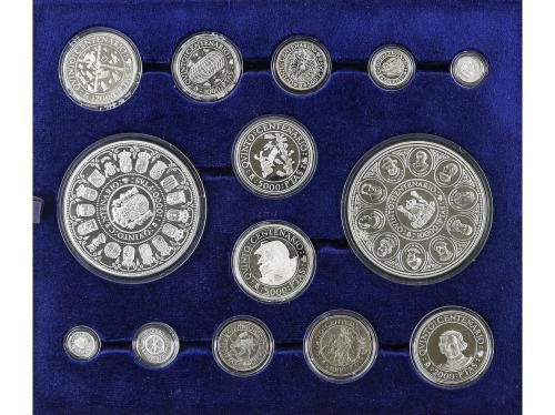 V CENTENARIO. Lote 28 monedas 100 a 10.000 Pesetas. 1989, 1990, 1991 y 1992. Cuatro series completas en plata. En estuche sin certificados. FDC.