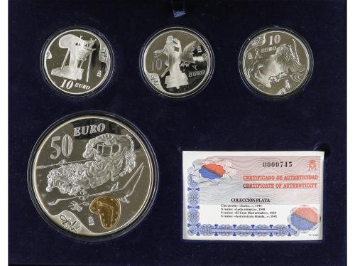 JUAN CARLOS I. Serie 4 monedas 10 (3) y 50 Euros. 2004. CENTENARIO DEL NACIMIENTO DE SALVADOR DALÍ. Leda atómica, el Gran Masturbado, Autoretrato blando con Bacon frito y Centenario Nacimiento Salvador Dalí. En estuche original (Serie Plata), con certificado. PROOF.