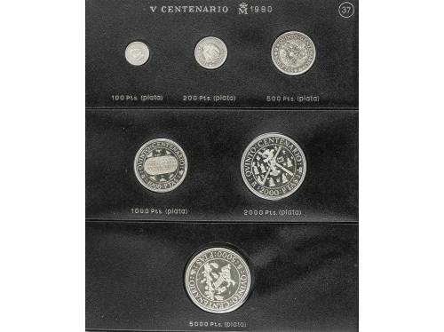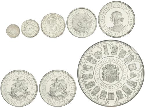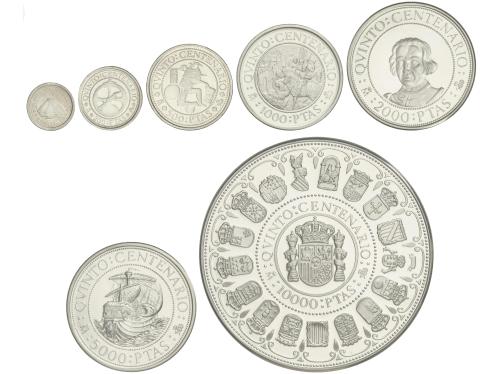 V CENTENARIO. Lote 7 monedas 100 a 10.000 Pesetas. 1989. Serie I completa en estuches originales con certificado. PG-629/31. FDC.