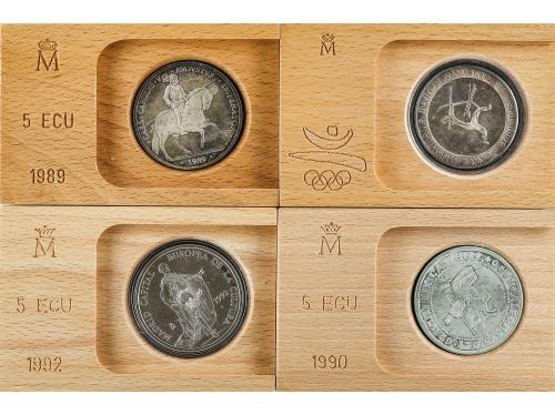 EMISIONES EN ECU. Lote 8 monedas 1, 5 (4) y 25 Ecu y 2.000 Pesetas (2). 1989, 1900 y 1992. Peso total de 306 grs. Contiene 1 y 5 Ecu (2) 1989, 5 Ecu 1990, 5 y 25 Ecu 1992 Madrid Capital Europea de la Cultura. Incluye 2.000 Pesetas Olimpiada de Barcelona Emblema Oficial y Arquero Prehistórico. Todo en estuche original, con certificado. FDC.