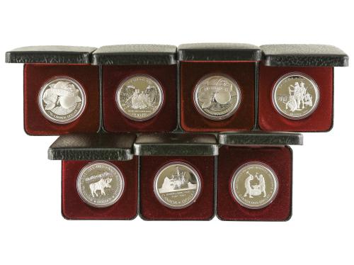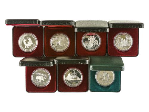 CANADÁ. Lote 7 monedas 1 Dollar. 1985 a 1998. Todas diferentes, conmemorativas. En estuche original. KM-143, 154, 161, 168, 170, 274 y 306. PROOF.