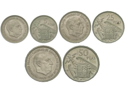 ESTADO ESPAÑOL. Serie 3 monedas 5, 25 y 50 Pesetas. 1957 (*BA). I Exposición Iberoamericana Numismática y Medallística. Barcelona. EBC- a EBC+.