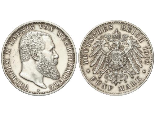 ESTADOS ALEMANES. 5 Mark. 1902-F. WILHELM II. WUERTTEMBERG. 27,70 grs. (Limpiada). KM-632. EBC-.
