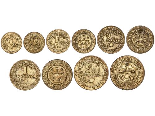 EMISIONES LOCALES GUERRA CIVIL. Serie 5 monedas 5 Céntimos a 2, 50 Pesetas. 1937. C.M. de MENORCA. AC-20/24; HG-203/207; Vti-L6/L10. MBC+ a EBC-.