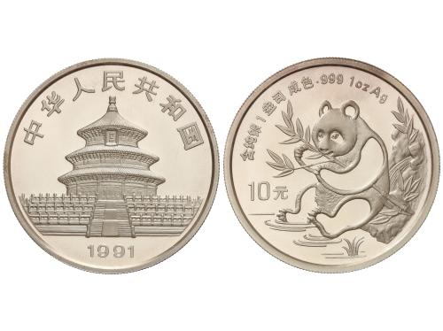CHINA. 10 Yuan. 1991. 31,14 grs. Panda en arroyo comiendo bambú. KM-386.1. FDC.