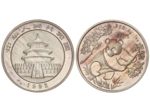 CHINA. 10 Yuan. 1992. 31,23 grs. Panda trepando por rama de eucalipto. Pátina. KM-397. FDC.