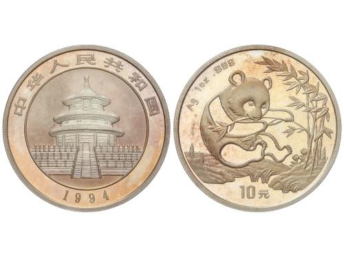 CHINA. 10 Yuan. 1994. 31,24 grs. Panda sentado comiendo bambú. Pátina. KM-A623. FDC.