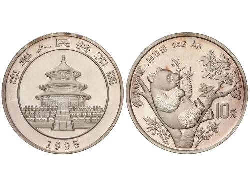 CHINA. 10 Yuan. 1995. 30,95 grs. Panda en árbol comiendo rama de bambú de 9 hojas. KM-732.1. FDC.